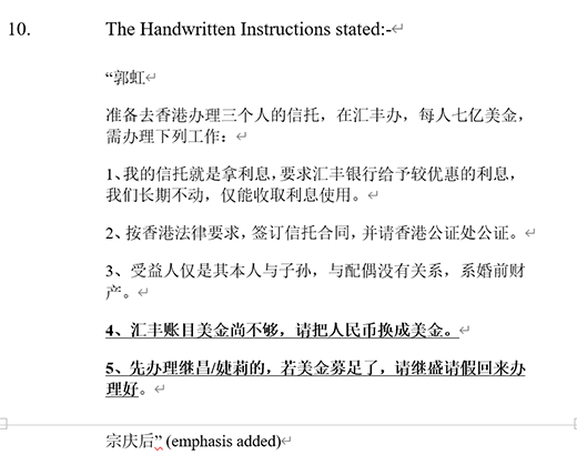 这份手写指示要求按香港法律签订信托合同,并经香港公证处公证,受益人仅限本人及子孙,与配偶无关,属于婚前财产。同时明确,信托长期不动用本金,仅能收取利息使用,若汇丰账户的美元不足,需将人民币换成美元,先办理宗继昌、宗婕莉的,等美元充足后再让宗继盛回来办理。