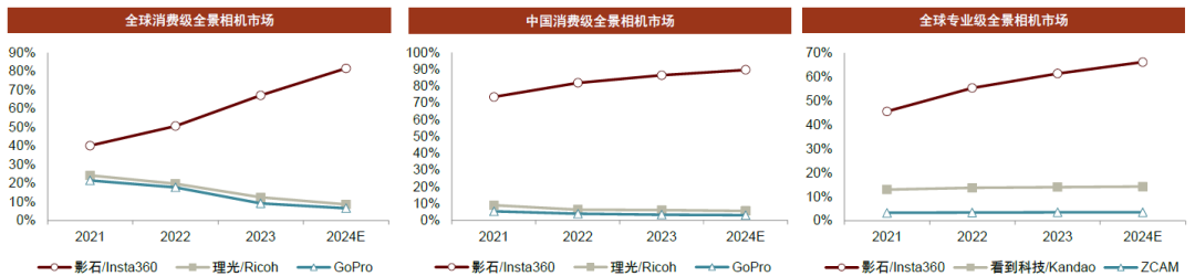 影石创新是全景相机市场中的最大龙头,且市占率持续提升。2015年VR热潮兴起,柯达、三星、理光等传统影像企业纷纷推出全景相机产品,因此全景相机行业初期的竞争格局较为分散。近年行业技术不断成熟,市场的竞争格局逐渐向头部集中,影石创新等国内企业凭借技术与营销优势逐步抢占市场份额。根据Frost & Sullivan,2023年全球消费级全景相机市场份额前三位分别为影石、日本理光、GoPro,市占率分别为67.2%、12.4%和9.2%。中国消费级全景相机市场份额占全球的五分之一,仍处于发展初期,2023年影石在中国市场占据86.5%的市场份额。专业级的VR全景相机市场则主要由影石和深圳看到科技主导,该新兴市场中大多数厂商处于探索阶段,随着商业模式的逐渐成熟,我们认为专业级全景相机有望进一步打开商业版图。