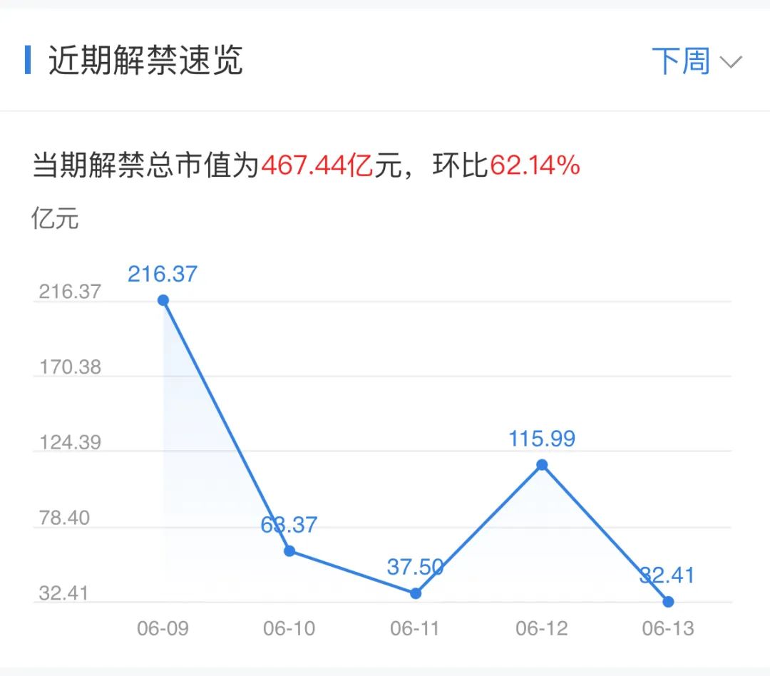 下周(6月9日至6月13日)有47家公司限售股陆续解禁,当期解禁总市值为467.44亿元,环比62.14%。
