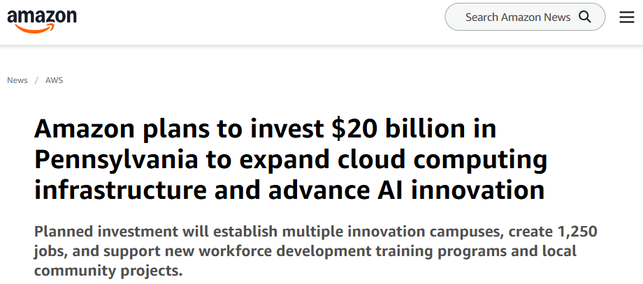 宾州州长乔希·夏皮罗在声明中写道,“凭借亚马逊至少200亿美元的承诺,我们赢得了该州有史以来最大的一笔私人投资。我们正创造机会,为社区创造税收,同时确保AI的未来从宾州出发。”