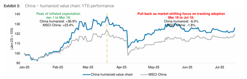 但在股价充分计入各类利好后,进一步超预期变得愈发困难。3月至7月,人形机器人相关概念股出现回调,板块整体回调幅度约6%。