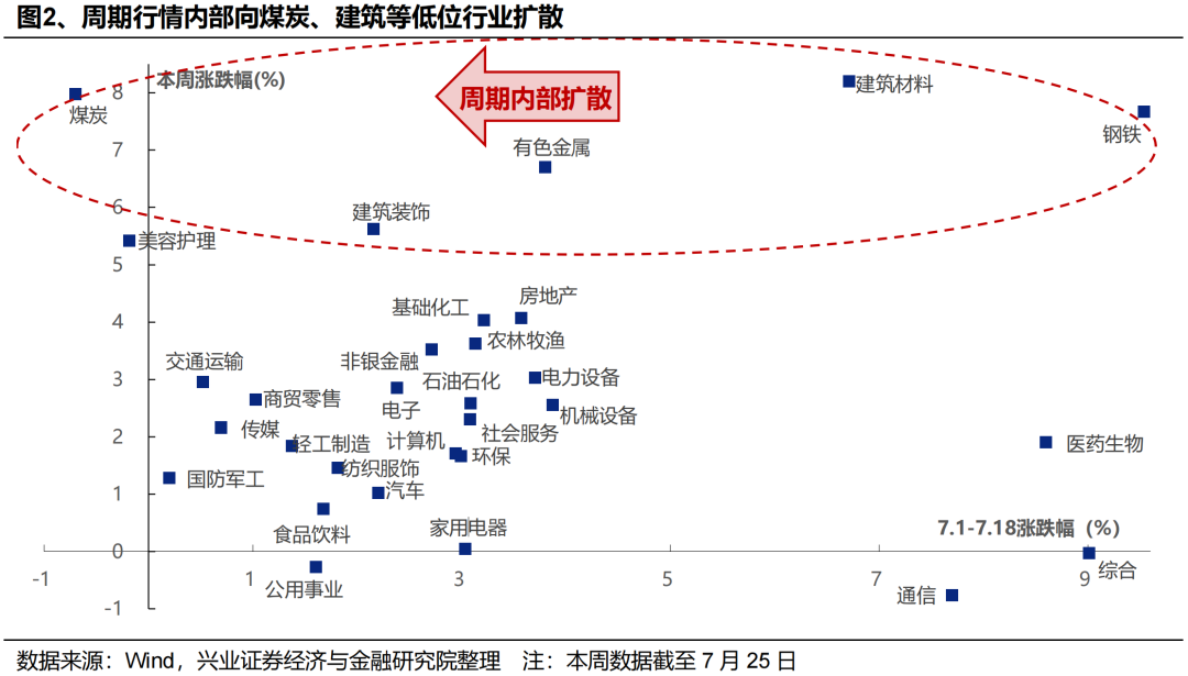 一方面,政策对于“反内卷”的决心不宜低估。此前市场预期本轮“反内卷”主要以行业自律为主,但可以看到近期国家层面已在出台各类政策,自上而下推动“反内卷”实施。7月以来,不仅有光伏、水泥、钢铁、焦炭等行业已经开始有减产、提价等实质性动作,7月18日工信部“钢铁、有色、石化、建材等十大重点行业稳增长工作方案即将出台”、7月22日国家能源局下场整治煤炭超产、7月24日发改委和市场监管总局就《价格法修正草案》公开征求意见,正在表明国家对于本轮“反内卷”的决心,资源品供给侧收缩的预期进一步强化。作为本轮最重要的政策主线之一,7月政治局会议有望对此作进一步部署。