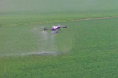 河南省封丘县赵岗镇永业家庭农场的农田里正在使用无人机进行“一喷三防”作业。