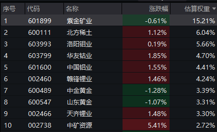 有色50ETF(159652)标的指数成分股多数冲高,中矿资源涨超5%,北方稀土、华友钴业、赣锋锂业等涨超1%,中金黄金、山东黄金等跌超1%,紫金矿业等回调。