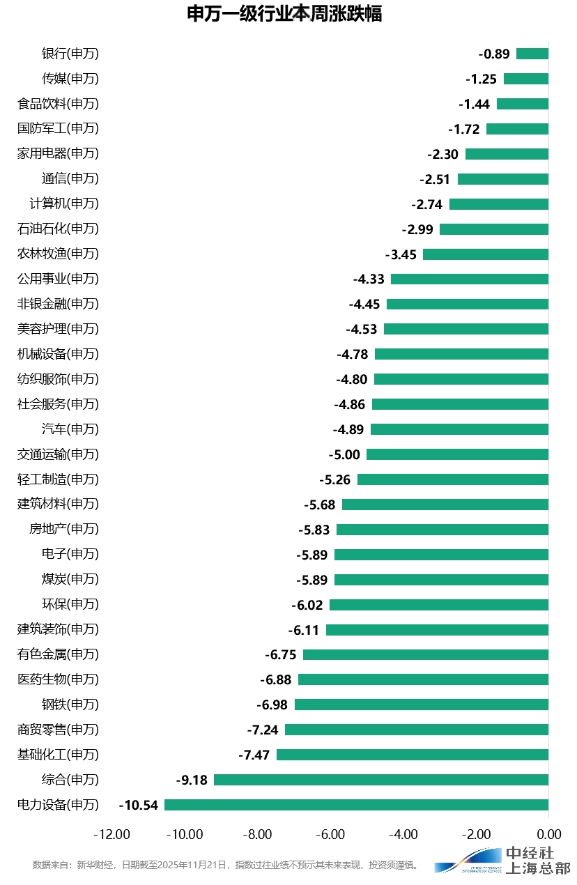 本周(11月17日至11月21日)A股市场主要宽基指数悉数回调。其中,上证指数周度下跌3.90%;深证成指周度下跌5.13%;创业板指周度下跌6.15%;新华500指数周度下跌4.18%。