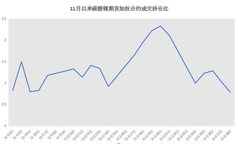 文华财经数据显示,碳酸锂期货的持仓量峰值为11月17日的111.9万手,在近期调整过程中虽然有部分资金撤离,但是截至11月28日午后持仓量已经回升至109万手左右。